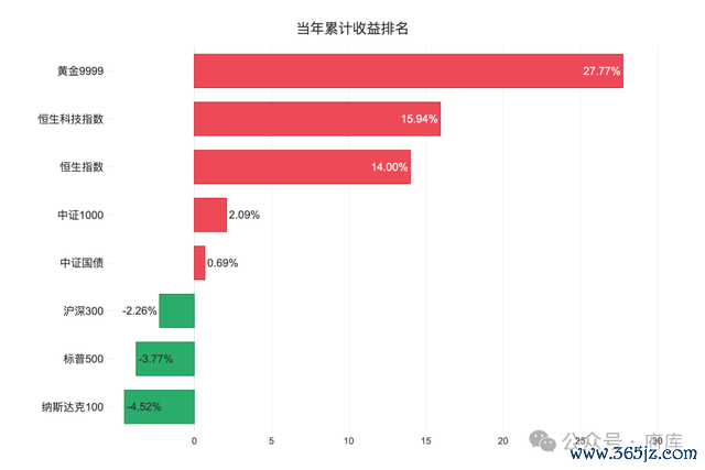 港股今年表现优异,其中恒生科技指数和恒生指数分别上涨15.94%和14.00%,虽然距离最大收益有一些回落,但在股票市场中都属于表现很好的了。A股内部分化明显,中小盘股表现略优,中证1000指数上涨2.09%,而沪深300指数则下跌2.26%。