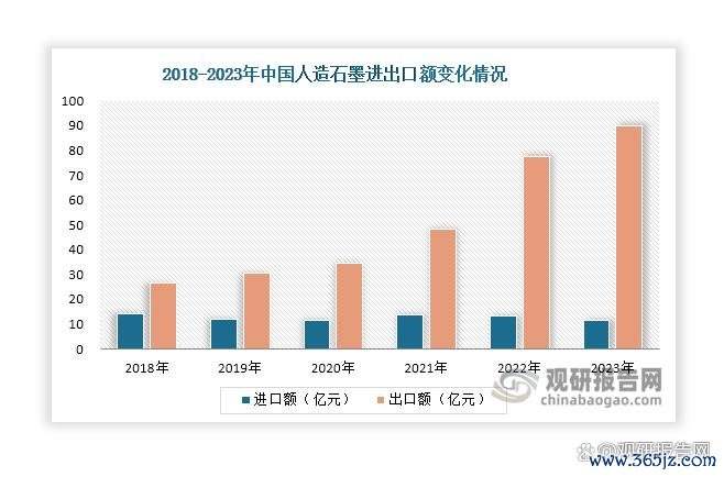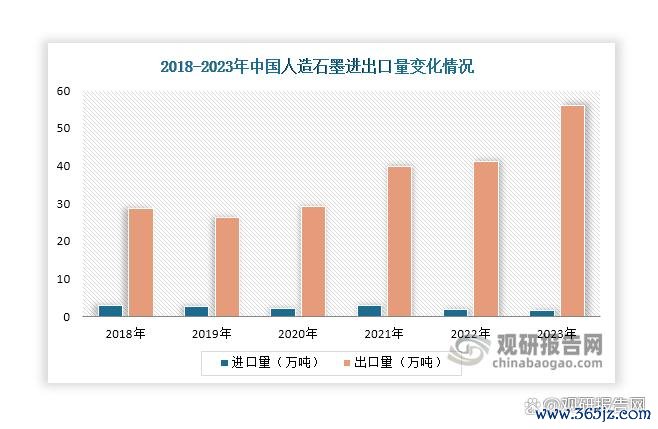 目前,我国人造石墨行业正处于供过于求状态,产品对外出口规模较大且始终大于进口规模。具体来看,近年来我国人造石墨进口量整体呈现下降态势,2023年降至1.55万吨,同比下降19.27%;进口额则呈现波动变化态势,2023年降至11.54亿元,同比下降14.2%。出口方面,自2019年起,海外市场人造石墨替代天然石墨需求不断增长,驱动我国人造石墨出口规模持续扩张,2023年其出口量和出口额分别上升至56.1万吨和89.81亿元,同比分别增长36.2%和15.66%。