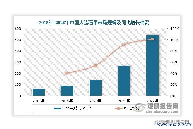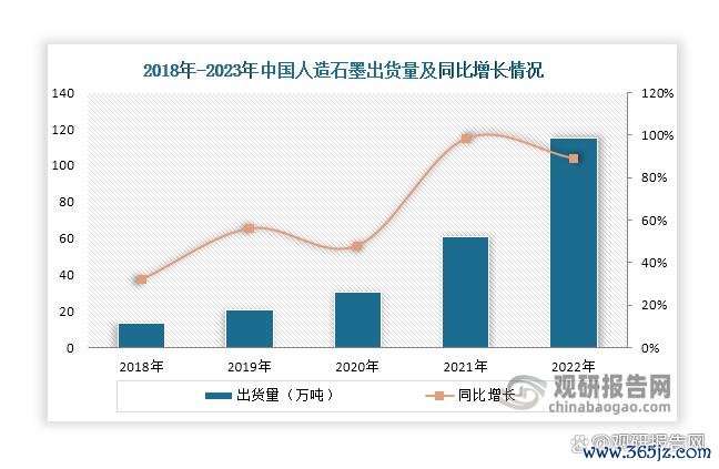 在新能源汽车快速发展带动下,叠加储能领域装机规模的上升,我国人造石墨下游市场需求旺盛,推动其市场规模和出货量不断攀升。数据显示,2022年其市场规模已突破500亿元,同比增长100.99%;出货量则上升至115万吨,同比增长88.98%。随着新能源汽车行业持续发展,预计未来人造石墨行业规模将继续扩张。