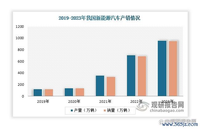 目前,我国主流的负极材料为天然石墨和人造石墨,两者合计占比90%以上。由于下游终端新能源汽车对于续航要求不断提高,而人造石墨产品性能更优、使用效果更佳,比天然石墨产品更能满足下游企业需求。因此人造石墨备受青睐,在负极材料中市场份额已超过80%。同时,近年来我国陆续出台《新能源汽车产业发展规划(2021-2035年)》等相关政策,支持和推动新能源汽车行业发展。在国家政策大力推动下,我国新能源汽车行业发展迅速,产量和销量持续攀升,为人造石墨行业带来了持续发展动力和广阔的市场空间。数据显示,2023年其产量和销量分别达到958.7万辆和949.5万辆,同比分别增长35.83%和37.87%。